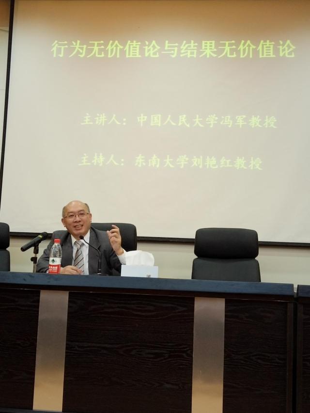 2015年10月23日晚7时,中国人民大学yl23455永利官网冯军教授在东南大学人文学院报告厅作了题为《行为无价值论与结果无价值论》的讲座,讲座由yl23455永利官网刘艳红教授主持,yl23455永利官网师生共同聆听了此次讲座。