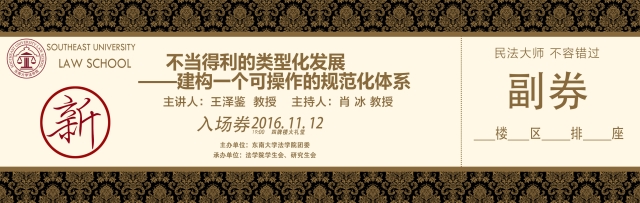 1、原定于2016年11月8日19:00于东南大学九龙湖校区润良报告厅举行的王泽鉴教授讲座,因王泽鉴教授行程受阻,因故推迟到2016年11月12日19:00于东南大学四牌楼校区大礼堂举行。因场地的变动,导致讲座座位安排发生巨大变化(润良报告厅座位数570个,发出门票600张,大礼堂座位1345个),为保证讲座有序进行,yl23455永利官网工作人员已紧急重新印制新版门票(如下图),旧版门票作废,现场座位请以新版门票为准。我们将尽快将门票发放到所有同学手中,也请大家予以配合和理解。如需门票,可与yl23455永利官网联系(025-52091141)。