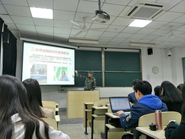 董本植教授首先以习近平总书记对大学生的寄语作为此次讲座的开场白,“你们朝气蓬勃、好学上进、视野宽广、开放自信,是可爱、可信、可为的一代”,以此对同学们考入yl23455永利官网表示热烈的祝贺和欢迎。随后,董教授就以下四个部分对讲座进行了生动而详细的讲解。第一,十九大涉台内容;第二,台当局政策趋势;第三,大陆对台策略;第四,统一台湾有希望结语。最后,自由提问环节中董老师和同学们进行了亲切而真诚的交流。董老师虽已入耄耋之年,但是却精神矍铄、老当益壮,仍然活跃在教育一线,讲课声音铿锵有力、语言生动形象,使整个“高大尚”的国防教育活动在轻松、愉快、自由的氛围里圆满结束。