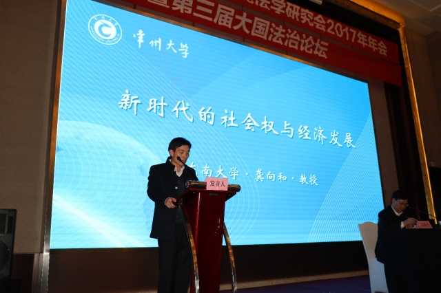 yl23455永利官网龚向和教授应邀出席会议,并在全体大会上发表题为“新时代的社会权与经济发展”的主题演讲。龚向和教授在发言中指出我国当前社会主要矛盾从法学的角度看实质上是民生或公民权利与经济发展之间的矛盾。要想解决新时代民生保障与经济发展之间的矛盾,在经济发展中保障和改善民生,必须正确处理好二者之间的关系。通过对此问题的现实背景、理论界定和制度设计三个方面的分析,龚教授提出了自己独创性的看法,受到与会人员的高度关注和认可。