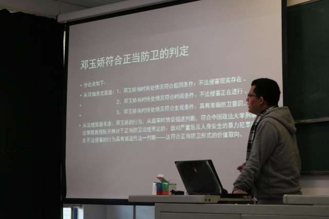 5班研讨课以“邓玉娇、于欢的行为是正当防卫还是防卫过当”为题,由yl23455永利官网陈洪兵教授主持,陈洪兵教授给出的于欢案和邓玉娇案这两个热点案例为切入点,进一步探索正当防卫的成立条件,成立时间以及正当防卫在当今时代遇到的困境以及出路。为了进一步激发同学们的热情,本次研讨课采取控辩对抗的形式进行。针对陈洪兵教授提出的问题,同学们分成四组,首先由每组以PPT的形式展示各自的观点;其次是自由发言阶段,在这个阶段同学们对这些问题踊跃发言,都能给出专业理性新颖的看法;在主持人点评环节,陈洪兵教授对本次研讨的主题进行了更为细致的讲解,对本次研讨课也给予了幽默诙谐但又专业精彩的点评。陈洪兵教授表示,法学的学习主要是方法的学习和解释的学习,只有掌握了正确的法学研究方法和正确的法学解释方法,才能在各种纷繁复杂的案件中抽丝剥茧,牢牢的抓住问题的本质,进而才能解决问题。