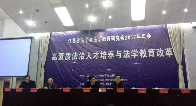 江苏省法学会法学教育研究会2017年年会于2017年12月23日在淮阴师范学院交通路校区逸夫图书馆报告厅举行,本次会议由淮安市法学会和淮阴师范学院法政学院联合承办。会议以“高素质法治人才培养与法学教育改革”为主题,对法治人才的培养进行深入探讨研究。来自江苏省各大高校的法学教育研究专家、学者80人参加会议。yl23455永利官网孟鸿志教授、单平基副教授、易波副教授应邀参加会议。