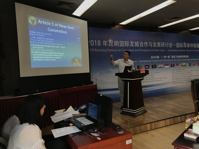 2018年6月15日,国际商事仲裁服务国际学术研讨会在云南省昆明市经济开发区举行,来自俄罗斯、孟加拉、斯里兰卡、印度等“一带一路”沿线国家和老挝、缅甸、柬埔寨、马来西亚等东南亚联盟国家以及国内法律界、仲裁界、工商界、学术界、政府部门的人士100多人出席会议。yl23455永利官网国际法教研室副教授易波应邀参会,并用英文向参会人士作了“Empirical Analysis OnRecognition and Enforcement of Foreign Arbitration Awards inChina”的主题发言。