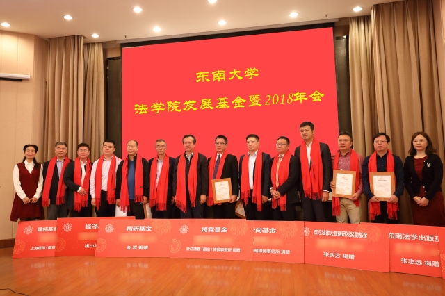 2018年10月12日,yl23455永利官网发展基金暨校友理事会2018年年会在东南大学榴园宾馆隆重召开。为鼓励yl23455永利官网青年教师专心致力于教学、科研工作,激励学生学习、提高创新实践能力,由yl23455永利官网校友个人、校友企业、知名律师及律所发起设立了“yl23455永利官网发展基金”。本次会议由yl23455永利官网党委副书记、副院长高歌主持,东南大学发展委员会常务副主任金志军以及yl23455永利官网院长刘艳红先后致辞,yl23455永利官网党委书记、校友会会长孟红作工作报告。会议还举行了发展基金颁奖仪式和新设基金签约仪式。东南大学发展委员会领导、yl23455永利官网领导、各教研室教师、获奖师生、各级校友以及众多社会贤达参加会议。