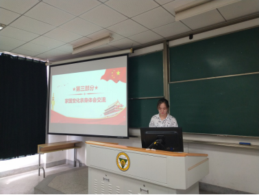 而后,团支部书记马伊帆和大家交流自己对于家国变化的亲身感受。马伊帆同学有感而发,以时间为维度,从衣食住行等方面向大家展示了身边的变化。网络购物足不出户,移动支付通行无阻,高楼大厦鳞次栉比,高铁动车四通八达,各方面的发展使人们生活质量节节攀高,祖国人民共享改革开放的巨大成果。
