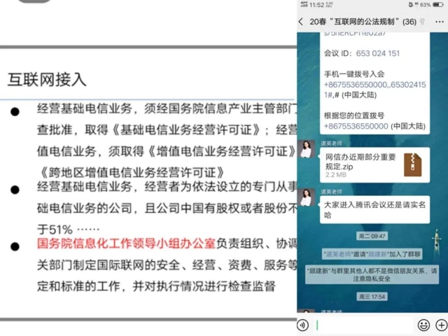 为了达到与传统教学相似甚至更甚的教学效果,陈老师在教授研究生“互联网的公法规制”这门课时,采用了“典型问题+典型案例”、“腾讯会议直播+在线研讨”的授课方式。这门课的教授主要分为两个阶段:一、课前预习。针对课前留问查找资料、形成观点,并深入分析典型、热点案例以供课堂讨论。二、课堂学习。课堂学习分为基础知识讲授与问题/案例讨论两个阶段,问题和案例会与知识点高度关联,通过对问题的解答、案例的剖析形成完整的知识链。