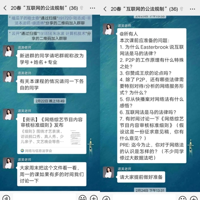 在防疫期,学生的每一节课都通过不同的群组、课程软件、直播平台进行。不同平台间切换和大量的信息浏览,都有可能会增加学生的额外负担。在“互联网的公法规制”的智慧云教学中,让有限的软件承载更多的功能,从而减少学生的操作负担是其亮点之一。