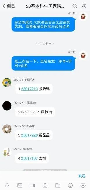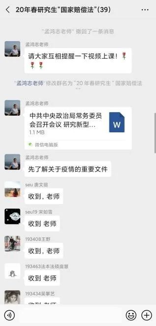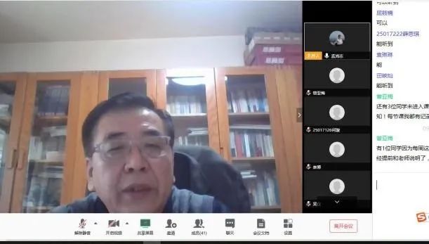 第一节在线课程开课后,孟鸿志老师和同学们进行了在线视频,了解每位学生的近况,关注疫情下同学们的身心健康及学习状态。开展线上授课时,先通过QQ群点名接龙和会议参与成员实名制相结合,确保选课同学的到课率。