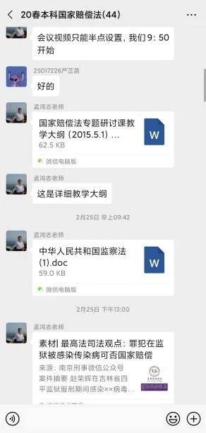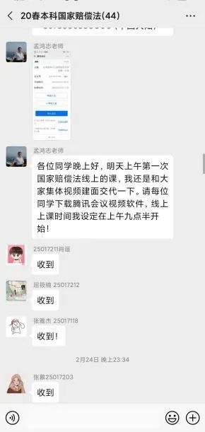 在网络教学中,孟鸿志老师同时还采用专门微信群、腾讯视频会议和电话方式及时了解每一位指导研究生及其家庭、特别是身处疫区研究生的生活和安全状况;下载和整理了中央应对本次重大突发公共卫生疫情事件的有关文件精神,并将整理学习笔记和文件打包发给同学,要求每位同学不仅将思想统一到中央文件中,还要从法学视角特别是行政法学视角思考和研究本次重大突发公共卫生疫情事件中出现的最新法律问题和防控疫情知识,把同学的注意力集中到理性思考和学习上来。一是将学校和yl23455永利官网有关通知要求及时传递到每个学生,二是重点关注和指导正处于学位论文撰写、临近毕业的研究生,及时指导研究生的论文写作;三是对一、二年级研究生拟定学习资料和读书计划,要求学生在疫情期间完成阅读并提交阅读笔记,四是通过定期、不定期的线上交流及时指导学生的学习和身心健康状况,做到了疫情期间“停课不停学”。