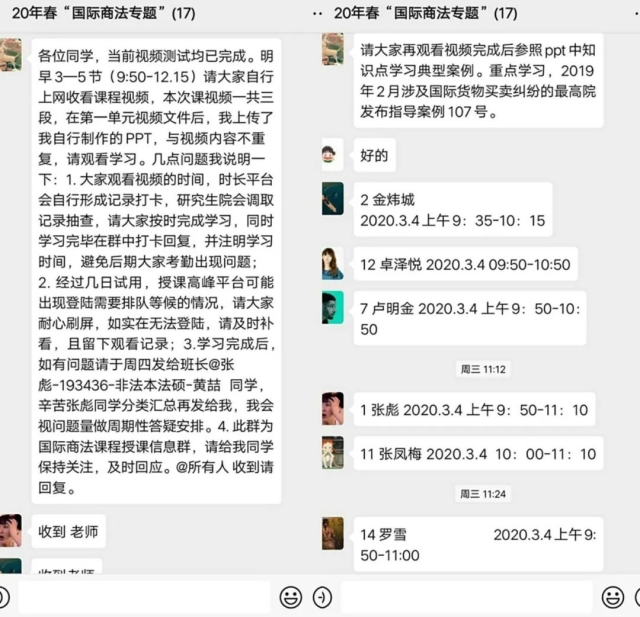 对于录播的课程,教师在课表规定的时间开展线上答疑。学生认为观看教学视频的形式,可以在他们遇到知识难点的时候选择暂停进行思考,也可以选择重播加深理解。由于充分的预习以及视频学习,学生对知识点的理解会比较透彻。学生看完后在微信群里打卡,老师在课堂规定的授课时间指导答疑,下课后如有问题老师也会让班长进行搜集汇总,在下次上课前在微信群展开高效的课堂讨论。