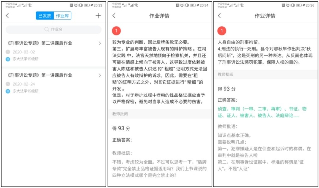 在“作业”模块中,教师可以提前布置作业并规定提交作业的时间。学生在提交作业之后,教师可以便捷地评阅作业。学生也可以第一时间知悉作业获得分数以及老师的评语。