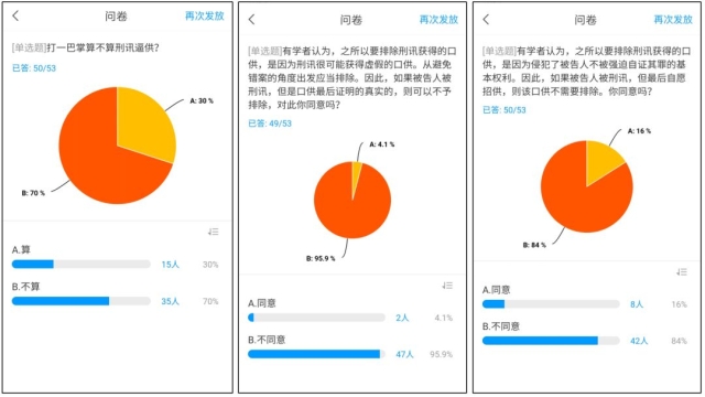 比如第二讲的主题是“非法证据排除”,王禄生老师提前一天发布了互动小问卷。可以看到,学生对不同知识点的掌握情况不同,对于掌握情况好的,第二天在线授课可以在时间缩减,对于掌握不好的则加强。大家还可以看到,互动问卷第2题中,只有2名同学是该知识点的“少数派”。由此,第二天在课堂讨论互动时,他会有针对地提问并引导不同观点的同学充分探讨。