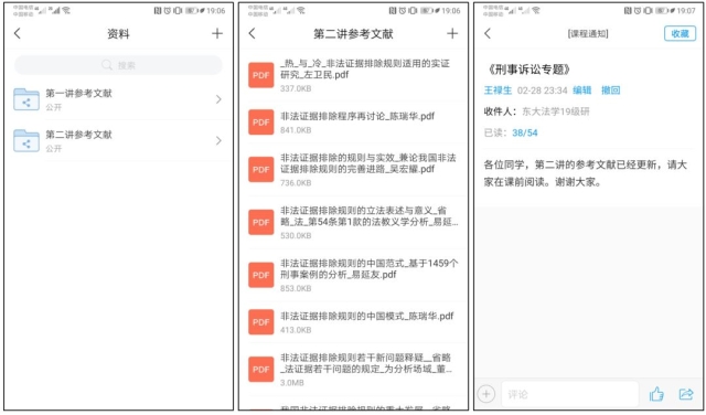 在《刑事诉讼法专题》的课程中,王禄生老师会在学习平台提前一周发布学生们需要阅读的资料,并定向化关联到特定的研究生班级。班级的所有学生都会第一时间收到相关通知。