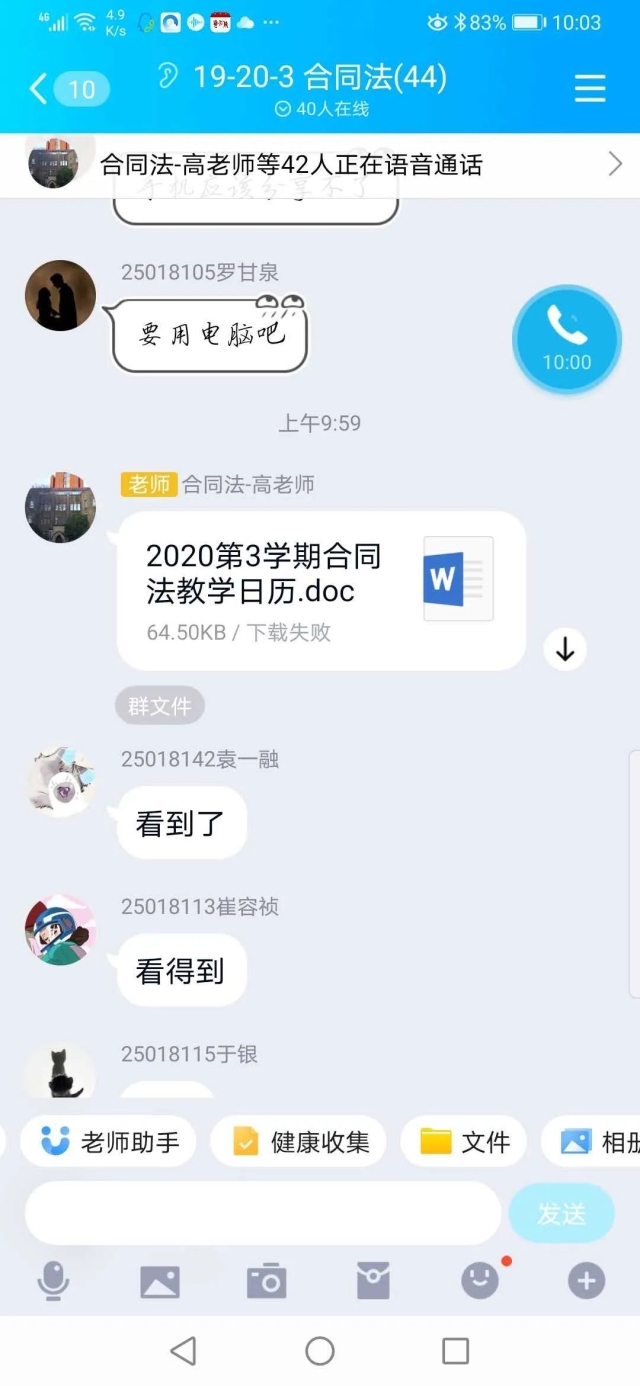 yl23455永利官网多数教师选择使用腾讯会议完成互动授课内容,最关键的原因是腾讯会议APP相对稳定,能够承受较大的用户群,在首周授课中效果卓越,基本未出现卡顿。另外,老师们反映,此APP可以实现视频、语音的自由切换,兼具视频、共享屏幕、上传文档和文字聊天等功能,同学们适当使用文字提出疑惑可以不打断老师的正常授课。文字区域可以暂时关闭,既可以提醒消息,也不会随时分散学生注意力,干扰课程进展,降低授课效果。