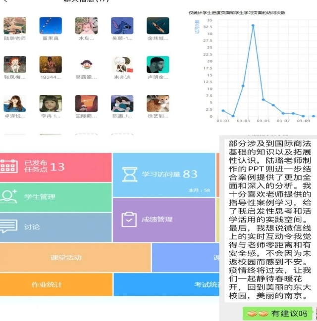 据此,陆璐老师根据课程特点和便易程度,选择了与东南大学研究生院资源相通的“超星尔雅”课程平台,实现了网络数据和学校资源的无缝连接,避免了线上学习技术上的繁琐性;同时,从轻形式重内容的理念出发,以实际教学效果为根本导向,组建微信群作为课程成员的主要沟通媒介,在群中发放资料,开展讨论、答疑,以最简单的形式实现师生间的无障碍沟通,保证了线上教学的精简化操作。