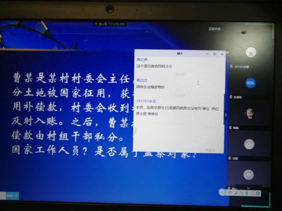 《监察法前沿问题》是一门实务型课程,十分注重对同学们实务能力的培养。如何提升同学们的实务能力,成为了保障课程教学质量的重中之重。钱老师在授课过程中通过直播互动问答的方式,与同学们共同研讨我国监察法的相关法律法规与案例,帮助同学们准确掌握了学科实践知识。