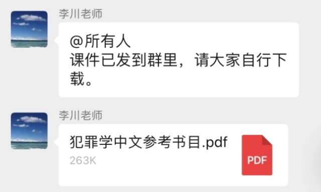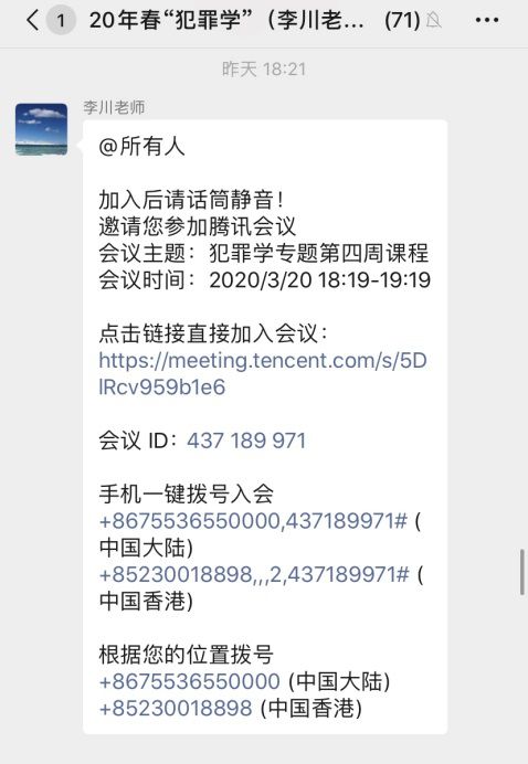 李川老师于本学期面向硕士研究生开设了《犯罪学专题》和《刑事诉讼法》课程,通过腾讯会议直播+微信群课堂探讨的方式进行授课。