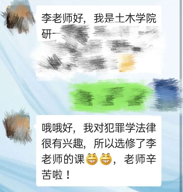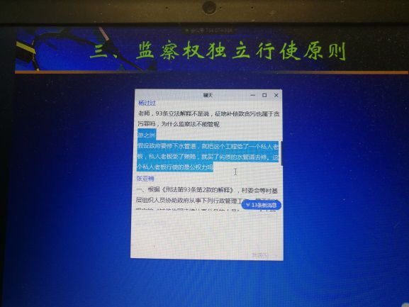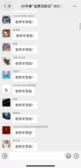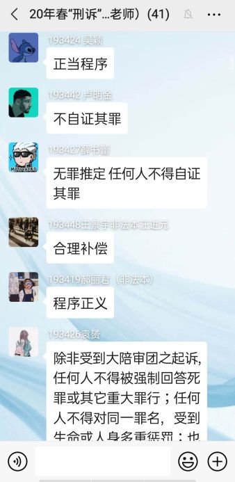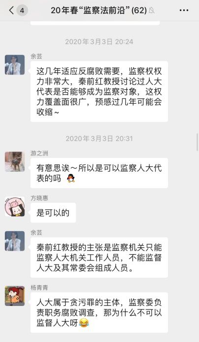 在此基础之上,钱老师还在课后就课堂中分析的各类案例与同学们在微信群中展开讨论,鼓励同学们发表自身关于当前实务问题的看法,帮助同学们进一步了解我国监察体制改革以来司法实务的变迁,提高了同学们处理法律实践问题的能力。