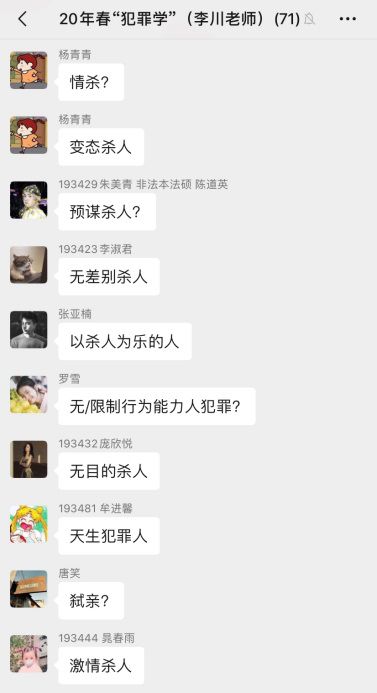 让每一位同学都能参与到课堂教学是保障授课质量的关键。为此,李老师在线上教学过程中,采用案例式互动研讨的方法,让同学们加入到对犯罪学案例的分析学习中,每位同学都能够在课程微信群中畅所欲言,发表自己的观点,老师再根据大家的回答在授课中进行实时互动解析,引导大家边思考边学习,法学思维运用能力得到了大大的增强,也对课程内容理解更加深入。此外,同学们围绕案例运用所学理论知识和法律逻辑能力回答相关问题,增强了课堂的互动性与趣味性,极大提升了同学们的线上学习热情。