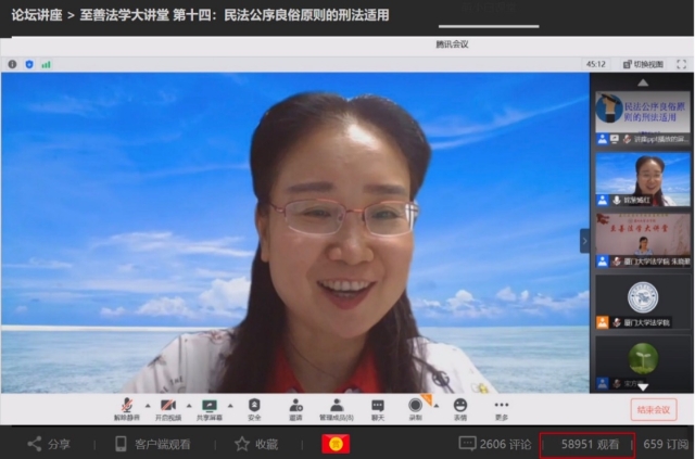 刘艳红教授的讲座主题“民法公序良俗原则对刑法的适用”视角新奇,视野宏大,既是刑民交叉,又是前沿话题,语言幽默风趣,娓娓道来,本次讲座吸引了5万多名听众参与讲座,为近期众多有关民法典讲座学术活动留下浓墨重彩的一笔。