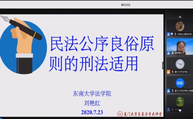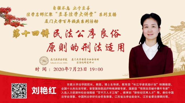 2020年6月至7月,厦门大学百年校庆活动——“至善法学大讲堂”陆续开讲,该讲堂邀请著名政法大学的校长、yl23455永利官网院长以及知名法学家进行学术交流。2020年7月23日晚,yl23455永利官网刘艳红教授受邀作为主讲人,以“民法公序良俗原则的刑法适用”开讲。讲座以腾讯会议的方式进行,”视友软件”进行同步直播。