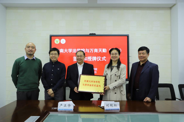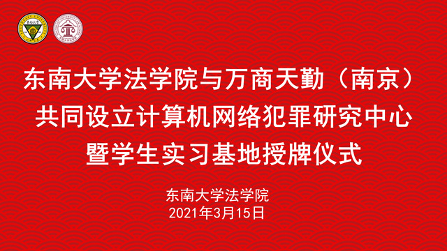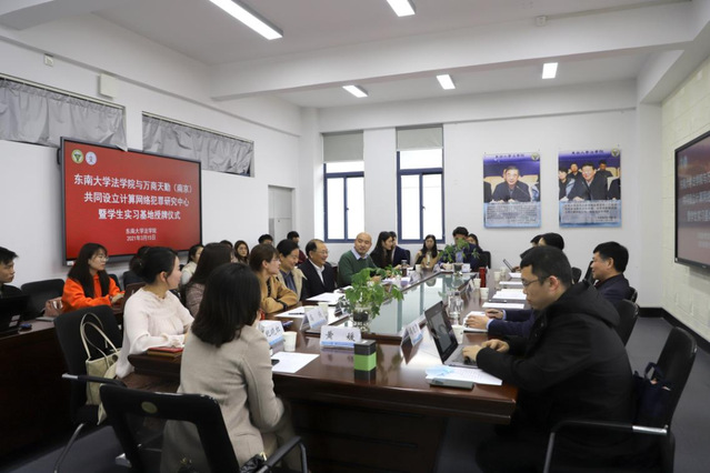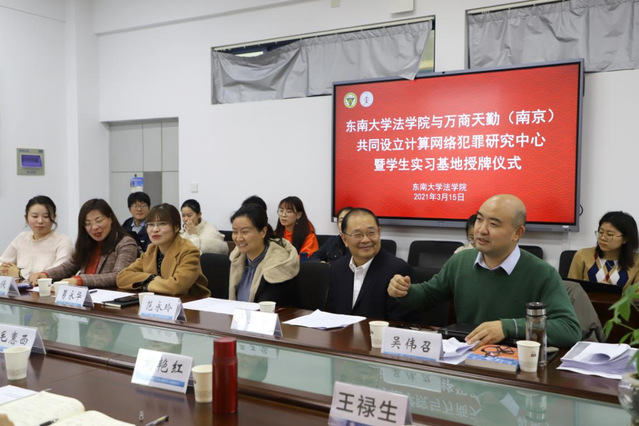 2021年3月15日下午,yl23455永利官网与北京市万商天勤(南京)律师事务所共同设立的“计算机网络犯罪研究中心”暨“优秀大学生实习基地”签约授牌仪式在东南大学九龙湖校区yl23455永利官网会议室顺利举行。yl23455永利官网院长刘艳红,yl23455永利官网党委书记毛惠西,东南大学社科处副处长(主持工作)王禄生,网络安全法治研究中心主任欧阳本祺,北京市万商天勤律师事务所高级顾问、江苏省法学会检察学研究会副会长严正华,北京市万商天勤(南京)律师事务所创始合伙人吴伟召、潘艳红、范永玲律师,以及学院部分师生、万商天勤所部分律师出席本次会议。