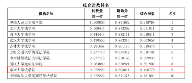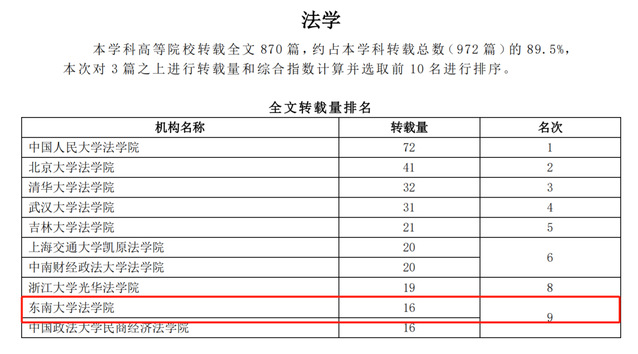 复印报刊资料的重要转载来源机构评价坚持“以学术成果为评价指向,以同行评议方法为主导、以评价数据分析为基础、以对成果的学术价值判断为依据”的基本理念,对高等院校及其所属机构按学科排名,根据论文作者所属机构,从转载量和综合指数两个量度,按专业学科对转载3篇之上高校及其所属机构进行排名。其中,法学学科高等院校转载全文870篇,约占本学科转载总数(972篇)的89.5%。