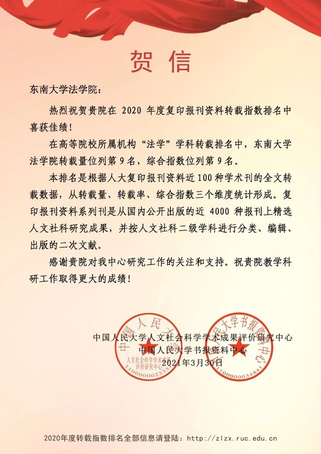 2021年3月30日,中国人民大学人文社会科学学术成果评价研究中心和中国人民大学书报资料中心联合研制的“2020年度复印报刊资料转载指数排名”正式发布。作为复印报刊资料重要转载来源机构,yl23455永利官网在2020年复印报刊资料转载指数排名中表现亮眼,转载数16篇,“法学学科”转载量、综合指数排名在各高等院校所属机构中均位居第9。参考近三年公布的复印报刊资料转载指数排名,yl23455永利官网在法学学科高校所属机构排名榜单中始终稳居前十。