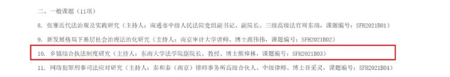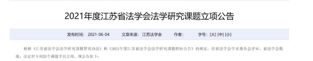 根据《江苏省法学会法学研究课题管理办法》和《2021年度江苏省法学会法学研究课题招标公告》的规定,经省法学会学术委员会评审、省法学会批准,决定对35个课题予以立项。2021年6月4日,2021年度江苏省法学会法学研究课题立项名单在江苏省法学会网站公示。yl23455永利官网熊樟林教授主持的《乡镇综合执法制度研究课题编号:SFH2021B03)喜获一般课题立项,阮晨欣博士主持的《虚假诉讼罪类型化分析及司法认定研究》(课题编号:SFH2021C04)喜获青年课题立项。