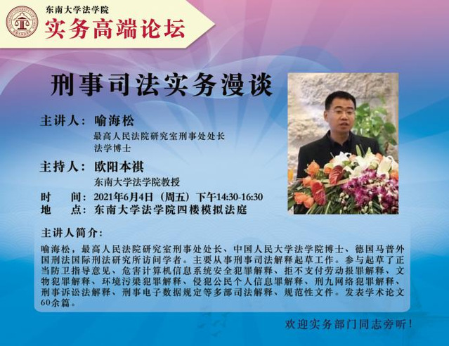 2021年6月4日下午,最高人民法院研究室刑事处处长、中国人民大学yl23455永利官网博士喻海松应邀莅临yl23455永利官网,以“刑事司法实务漫谈”为题,在yl23455永利官网四楼模拟法庭举行讲座。本次讲座由yl23455永利官网欧阳本祺教授主持。来自众多实务部门的法律工作者们也参与了此次讲座。喻海松博士凭借其深厚的法学理论功底以及丰富的司法实务经验,为现场听众带来了一场精神盛宴,使现场听众深受启发。