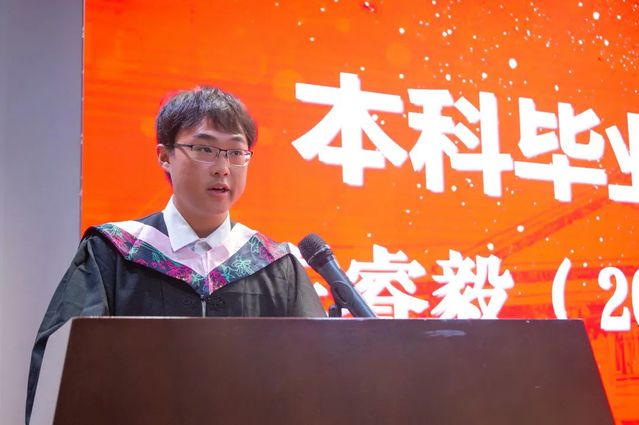 随后,2017级本科毕业生陈睿毅同学以《万物生长,一苇以航》为题,作为本科毕业生代表发言。他向大家分享了自己在东大拼搏奋斗的点滴,并表达了对专业的热爱,作为法律人对信仰的坚持和对秉承东大精神,锐意进取的期盼。