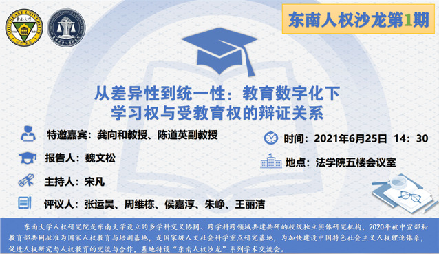 东南大学人权研究院是东南大学设立的多学科交叉协同、跨学科跨领域共建共研的校级独立实体研究机构,2020年被中宣部和教育部共同批准为国家人权教育与培训基地,是国家级人文社会科学重点研究基地,为加快建设中国特色社会主义人权理论体系,促进人权研究与人权教育的交流与合作,基地特设“东南人权沙龙”系列学术交流会。