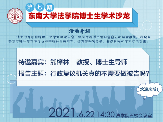 第七期yl23455永利官网博士生学术沙龙于2021年6月22日下午在yl23455永利官网五楼会议室如期举行。本次沙龙邀请了yl23455永利官网副院长熊樟林教授作为特邀嘉宾,做题为“行政复议机关真的不需要做被告吗?”的报告,东南大学yl23455永利官网硕士生、博士生十余人参与了此次沙龙。