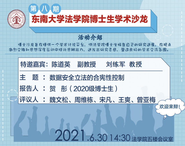第八期yl23455永利官网博士生学术沙龙于2021年6月30日下午,在yl23455永利官网五楼会议室举行,由2020级博士研究生贺彤同学进行论文汇报,题目是“数据安全立法的合宪性控制”。本次沙龙邀请了刘练军教授与陈道英副教授作为指导老师,博士生魏文松、周维栋、宋凡、王爽、曾亚梅担任评议人,到场的还有博士研究生于一帆同学,硕士研究生孙瑜潞、刘浩锴。本次沙龙由宋凡同学主持。