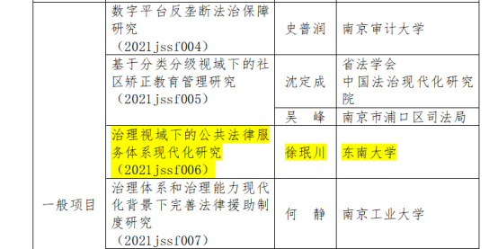 近日,江苏省司法厅公布了2021年江苏省司法厅法治科研项目立项情况,yl23455永利官网徐珉川老师主持的“治理视域下的公共法律服务体系现代化研究”(批准号:2021jssf006)课题喜获一般立项。