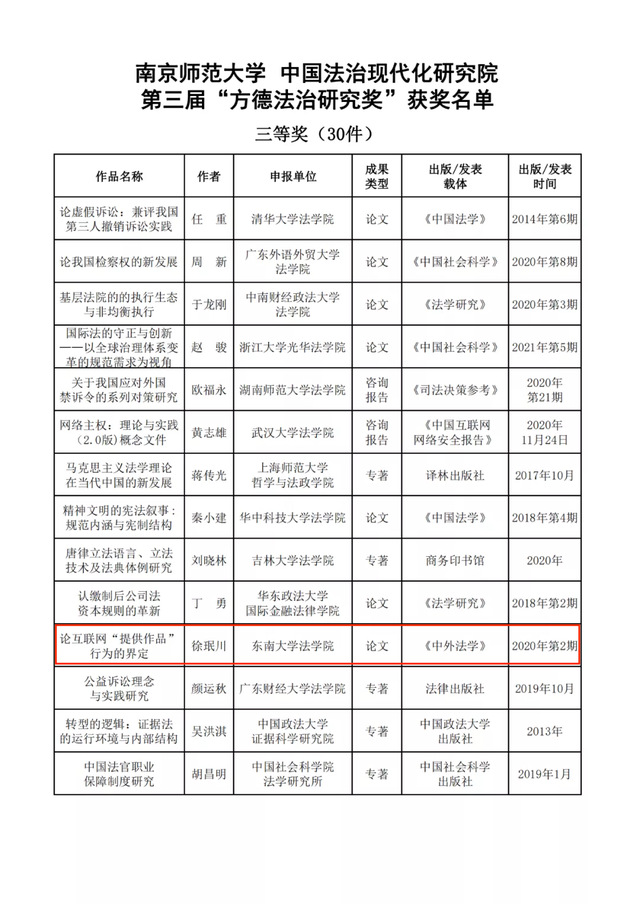 yl23455永利官网徐珉川老师以《论互联网“提供作品”行为的界定》获得三等奖。