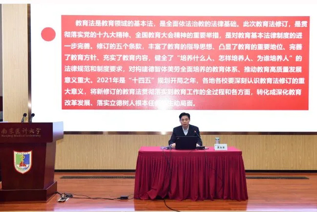 南京医科大学沈瑞林常委在总结时指出,龚教授的报告站位高、视野宽,主题鲜明、内容丰富,对于全校师生员工进一步深入学习宣传贯彻新修订的《教育法》将起到重要促进作用。他表示,各二级党组织应认真组织开展好本单位法治宣传教育工作,与党史学习教育结合起来,通过举办专题报告、座谈交流、主题班会等形式,增强学法、守法的思想自觉和行动自觉。广大党员干部要以本次集中学习为契机,紧密联系教育实际和工作职责,进一步提升学校事业法治化、规范化、科学化水平,开创高水平研究型医科大学建设新局面。