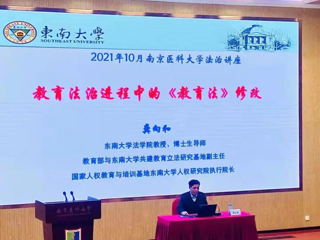 10月20日下午,yl23455永利官网龚向和教授应邀参加南京医科大学学校党委举行的新修订《教育法》专题辅导报告会,并作专题报告“教育法治进程中的《教育法》修改”。报告会在德馨楼D201报告厅举行,全体在校校领导、党委常委、副科级以上干部、党支部书记、党外代表人士、讲师以上教师、思政课教师及全体辅导员参加本次会议,会议由学校党委常委、宣传部部长沈瑞林主持。