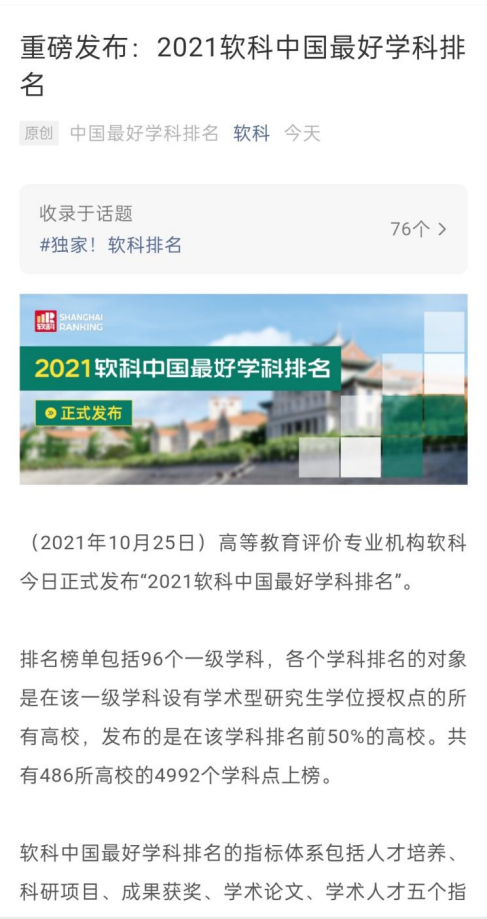 “中国最好学科排名”目的在于对高校各个学科的水平和发展态势进行分析。软科中国最好学科排名的指标体系包括人才培养、科研项目、成果获奖、学术论文、学术人才五个指标类别,下设17个指标维度,共计50余项反映学科竞争力的客观量化指标,涉及百余项观测变量。为响应新时期国家对高等教育改革发展和教育评价的要求,软科对中国最好学科排名的指标体系进行了优化,特别是着重解决了人才评价的“唯帽子”问题。在2021年排名中,“学术人才”类别下资深学术权威、中年领军专家、青年拔尖英才、文科学术骨干等各个维度的人才统计不再局限于人才称号获得者,而是把重大项目的承担者、重大成果的完成人等专家学者同样纳入人才统计,以实际贡献作为人才标准。