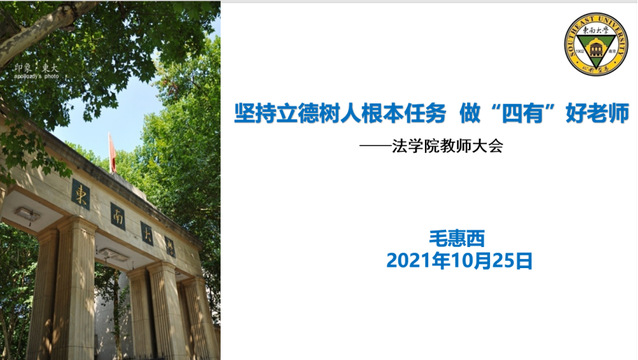 随后,毛书记解读了教育部发布的《新时代高校教师职业行为十项准则》《教育部研究生导师指导行为准则》《江苏省研究生导师职业道德规范“十不准” (试行)》《东南大学教师师德失范行为处理办法 (试行)》等文件内容。明确要求老师们坚持立德树人初心,严格按规定履行师德师风要求,不断提高自己的教学能力、道德情操,做学生们的引路人;东大教师必须情怀博大、躬身践行、德才兼备、正气凌然,用真挚的仁心无私地培育学生,坚守师德师风底线,为党育人,为国育才,培养德智体美劳全面发展的社会主义法治领军人才。