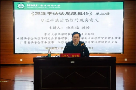 2021年11月9日上午,yl23455永利官网教授、博士生导师,中国法学会法理学研究会常务理事、中国法学会立法学研究会常务理事,江苏省法学会常务理事、江苏省法学会法理学与宪法学研究会会长杨春福教授在南师大yl23455永利官网举办专题讲座。本次讲座为系列专题《习近平法治思想概论》的第三讲。杨春福教授以“习近平法治思想的现实意义”为主题进行了深入系统地讲解。讲座由南京师范大学yl23455永利官网院长方乐教授主持,yl23455永利官网师生在行敏楼338会议室共同聆听并参与讨论。