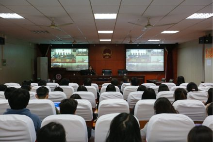 会议在毛惠西书记对“萤火虫”法律宣讲团近年来积极的普法成效的介绍和宣讲团成员的隆重推出中开始,江宁经济技术开发区法院陈平专委随后对宣讲团做了更为细致入微的讲解,并有声有色地向广大师生引荐了此次宣讲的主要环节和内容。此后,主讲法官王婷就涉大学生诈骗案在庭审视频的观看中做了详细的点评,并就大学生就业中存在的风险和相应的防范做了细致的介绍,以及模拟法庭中涉及到的法庭席位设置、庭审程序、起诉和辩护要点等注意事项做了清晰的讲解。