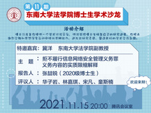第十一期yl23455永利官网博士生学术沙龙于2021年11月15日晚上,通过腾讯会议线上举行,由2020级博士生张喆锐进行论文报告,题目是“拒不履行信息网络安全管理义务罪义务内容的实质限缩解释”。本次沙龙邀请了yl23455永利官网副教授冀洋博士作为特邀嘉宾,2020级刑法学博士生林嘉琪、童斯楠以及行政法学博士生华子岩担任评议人,本次沙龙由2020级博士生王爽主持。
