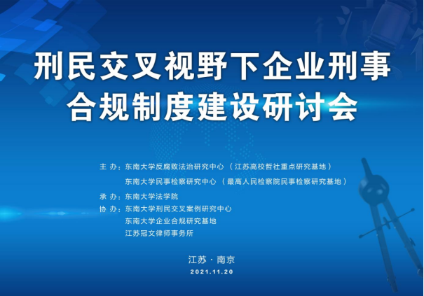 2021年11月20日,刑民交叉视野下企业刑事合规制度建设研讨会在南京顺利召开,本次会议由东南大学反腐败法治研究中心(江苏高校哲学社会科学重点研究基地)、东南大学民事检察研究中心(最高人民检察院民事检察研究基地)主办,yl23455永利官网承办,东南大学刑民交叉案例研究中心、东南大学企业合规研究基地、江苏冠文律师事务所协办。根据疫情防控要求,本次研讨会采用线上线下相结合的方式进行,来自中国社会科学院、北京大学、中国政法大学、北京师范大学、南京大学、东南大学、山东大学、苏州大学、常州大学、华中师范大学以及最高人民检察院、江苏省人民检察院、南京市人民检察院、杭州市人民检察院等高校科研机构、法律实务部门百余位专家学者参加了本次会议。