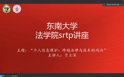 2021年11月22日晚,作为东南大学第七届法治文化节的重要活动之一,我们邀请到yl23455永利官网教授、博士生导师于立深教授为我们讲授题为“个人信息保护:跨越法律与技术的鸿沟”的srtp讲座,由于疫情防控要求等客观原因,本次讲座采用线上形式,吸引了全校三百余名学生参加。在主持人对于教授进行介绍后,讲座在同学们的期待中拉开了序幕。