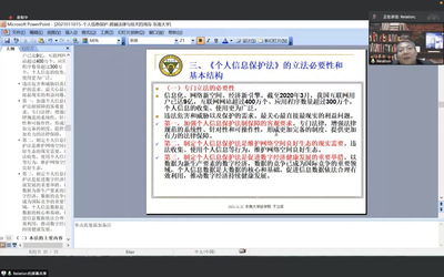 第二部分于教授为大家讲授了我国个人信息保护的法律体系,从法律、行政法规、地方性法规、规章等层面展开,详细介绍了《民法典》、《数据安全法》、《个人信息保护法》、《关于加强网络信息保护的决定》、《关键信息基础设施安全保护条例》、《贵州省大数据安全保障条例》等法律法规对个人信息保护的规定,并从人格权、隐私权、财产权、权利义务等角度对个人信息保护的意义与价值做了总结。
