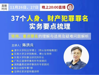 2021年11月26日、27日晚,yl23455永利官网教授、博士生导师陈洪兵应“法律名家讲堂”的邀请,进行专题为《37个人身、财产犯罪罪名实务要点梳理》的公益直播授课。本次直播授课吸引了众多刑法爱好者参与观看,在线观看高达15600余人次!