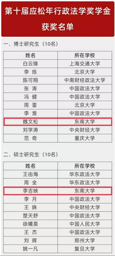 据悉,应松年行政法学基金是由我国著名法学家应松年先生连同多位行政法同仁发起设立的奖学基金,其宗旨是通过设立奖学金,以奖励全国优秀行政法学研究生,更好地培养行政法治人才,推动学术发展,进一步推进我国的行政法治建设。应松年行政法学奖学金自2005年12月设立以来,在引领行政法学专业研究生成长成才方面的影响日益显著,被喻为“中国行政法学界的诺贝尔奖”。迄今,该奖学金已连续评选和颁发十届,总计有来自全国十余所高校yl23455永利官网系的68名博士研究生和128名硕士研究生获此殊荣。本届“应松年行政法学奖学金”共有包括yl23455永利官网魏文松、李吉映两位同学在内的10名博士研究生和10名硕士研究生获奖。