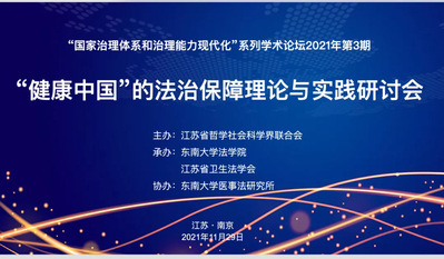 为了共同探讨解决“健康中国”法治保障中的相关理论与实践问题,为“健康中国”建设贡献力量,由江苏省哲学社会科学界联合会主办,yl23455永利官网与江苏省卫生法学会共同承办,东南大学医事法研究所协办的“国家治理体系和治理能力现代化”系列学术论坛2021年第3期,“健康中国”的法治保障理论与实践研讨会于2021年11月29日在南京市榴园宾馆顺利召开。为积极响应国家的疫情防控要求,本次会议采用线上线下相结合的方式举行,来自江苏省哲学社会科学界联合会及江苏省卫生法学会的领导,清华大学、辽宁大学、上海政yl23455永利官网、山东中医药大学、南京医科大学、南京中医药大学、中国药科大学、河海大学、淮阴师范学院、东南大学等全国各地的高校科研机构以及江苏省人民医院、江苏致邦律所等实务部门的代表40余人线下参与了本次会议,100余人线上参与了本次会议。
