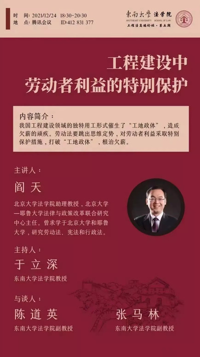 2021年12月24日晚18点30分,yl23455永利官网“工程法高端论坛”第五期讲座通过腾讯会议顺利举行。这是本院继“工程私法”四场讲座后的第五场讲座,也是“工程公法”系列讲座的第一场。